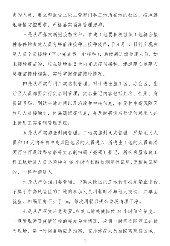 六、從嚴實施全封閉管理。工地實施封閉式管理,辦公區、施工作業區、生活區只保留一個出入口,其它出入口應采取有效封閉措施。嚴禁無關人員和近14天內來自中高風險地區的人員進入。所有進出房屋市政工地(包括施工作業區、辦公區、生活區)的人員必須百分之百通過粵省事等實名掃碼(亮碼)登記。所有房屋市政工地新進人員必須持有48小時內核酸檢測陰性證明,無相關證明的,一律嚴禁進入;要求進行全員核酸檢測的市縣(區),所有參建人員須持有當地規定時間之日起的檢測結果,否則不得進入工地。